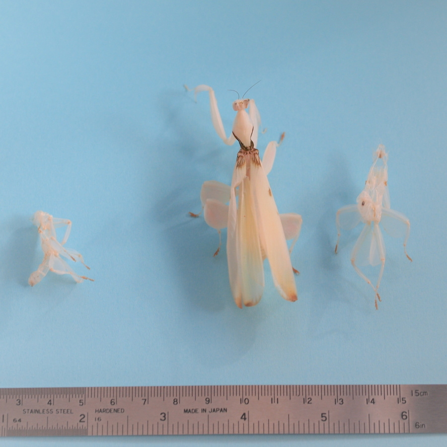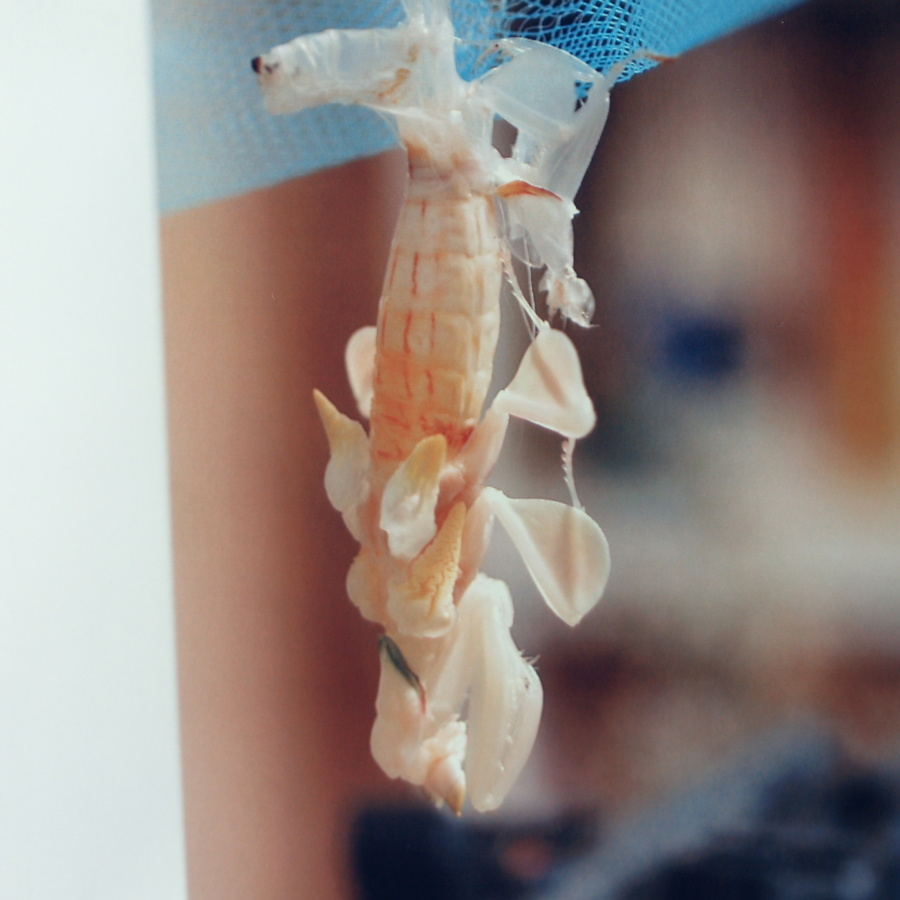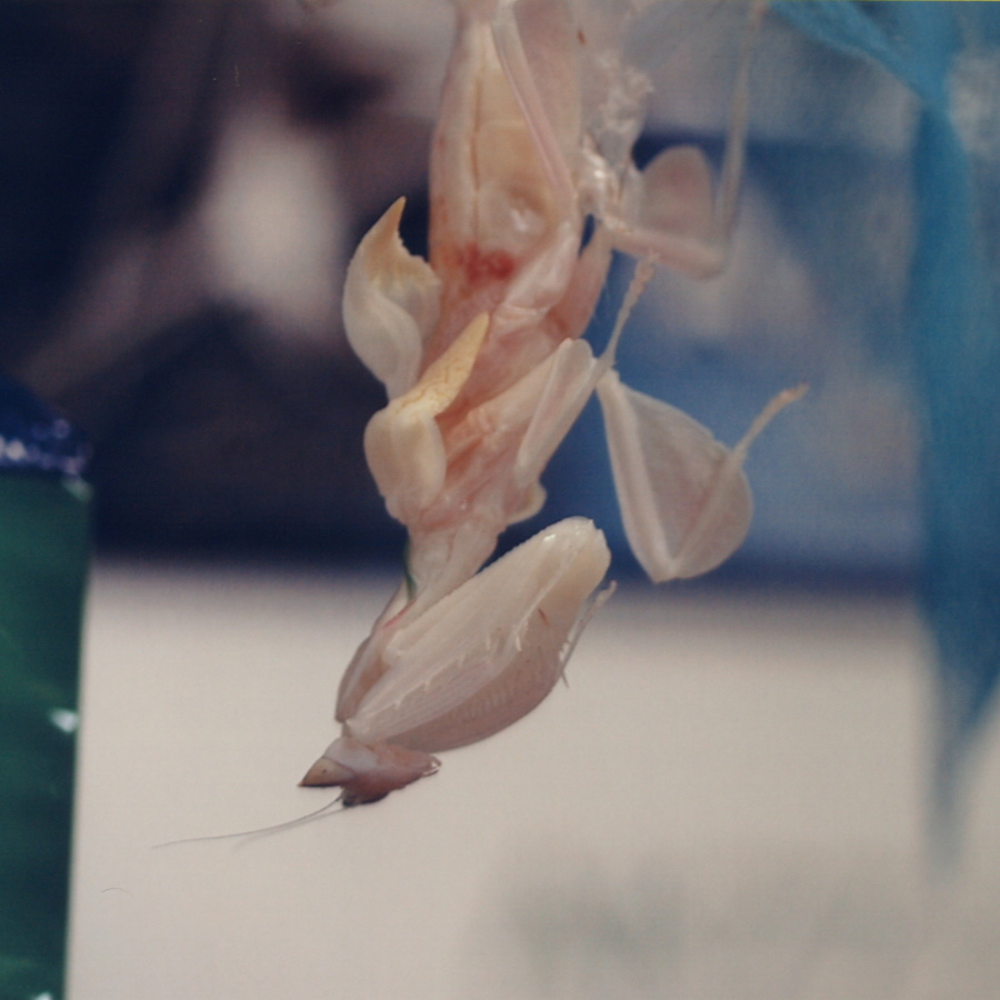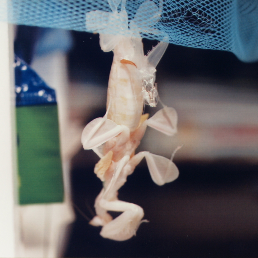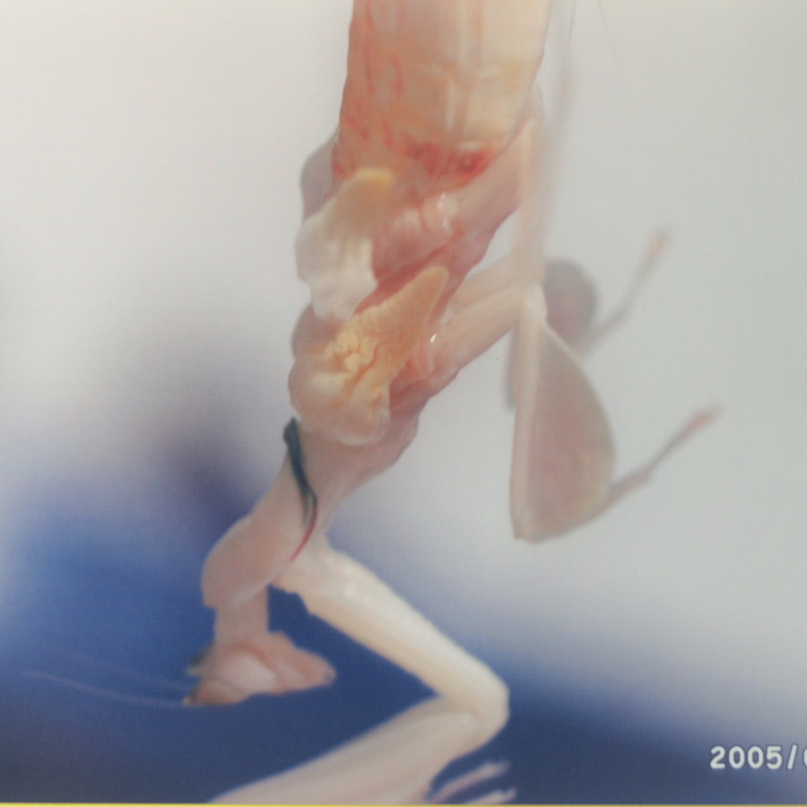 パンパンに膨れたお腹に注意!(Photo.1)と比べてもなぜこんなにお腹が膨れてるの でしょう?推測するに、脚が全て殻の外へ出ていて体を支えているのが殻に僅かに残っているお腹だけなので、お腹を膨らませて殻からお腹が抜 けないようにしているものとおもいます。一見何もしていないようですが、これはカマキリにとってはかなり辛い時間ではないかと思います。