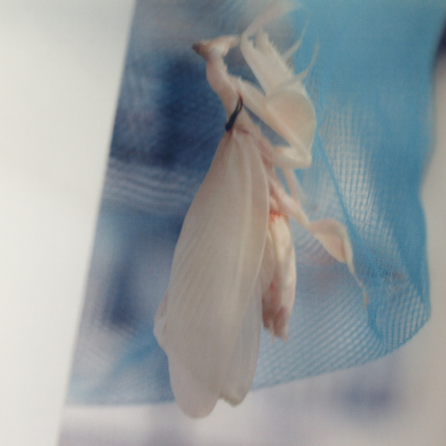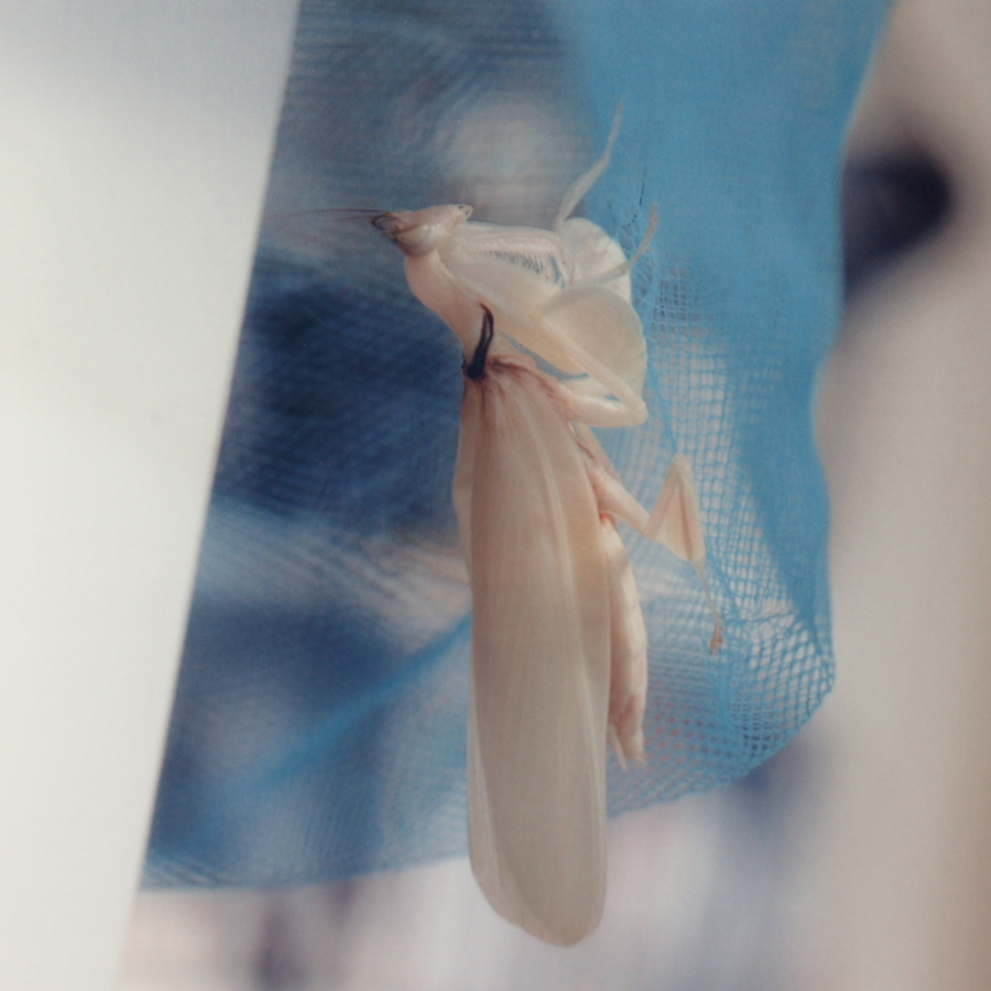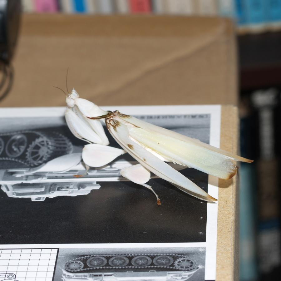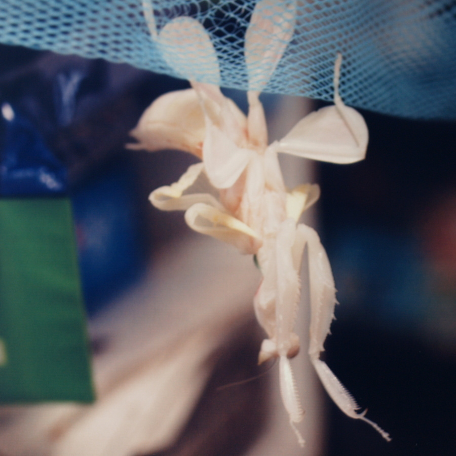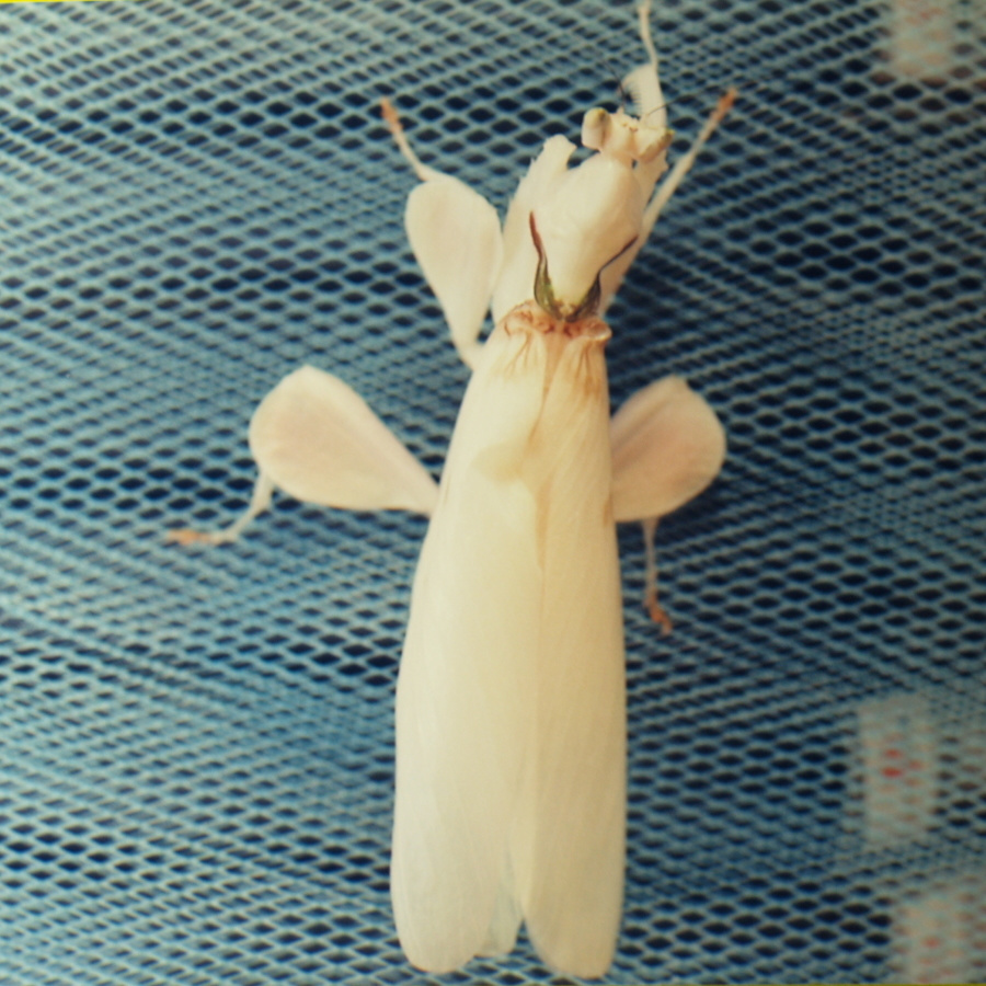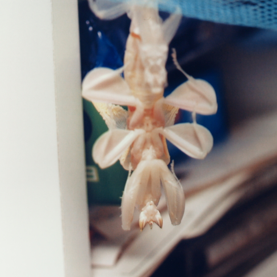 パンパンに膨れたお腹に注意!(Photo.1)と比べてもなぜこんなにお腹が膨れてるの でしょう?推測するに、脚が全て殻の外へ出ていて体を支えているのが殻に僅かに残っているお腹だけなので、お腹を膨らませて殻からお腹が抜 けないようにしているものとおもいます。一見何もしていないようですが、これはカマキリにとってはかなり辛い時間ではないかと思います。